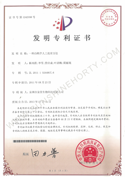 公司先后申報(bào)了20多項(xiàng)專利,獲準(zhǔn)專利15個(gè),通過(guò)新品種省級(jí)認(rèn)定4個(gè)。自主選育的新品種“新星”紅掌、“紅心”紅掌獲農(nóng)業(yè)部新品種權(quán)保護(hù);“陽(yáng)光之夢(mèng)”,“陽(yáng)光之戀”,“陽(yáng)光之星”系列白掌新品種獲產(chǎn)品商標(biāo)保護(hù)。公司對(duì)自主知識(shí)產(chǎn)權(quán)進(jìn)行了有效保護(hù)。