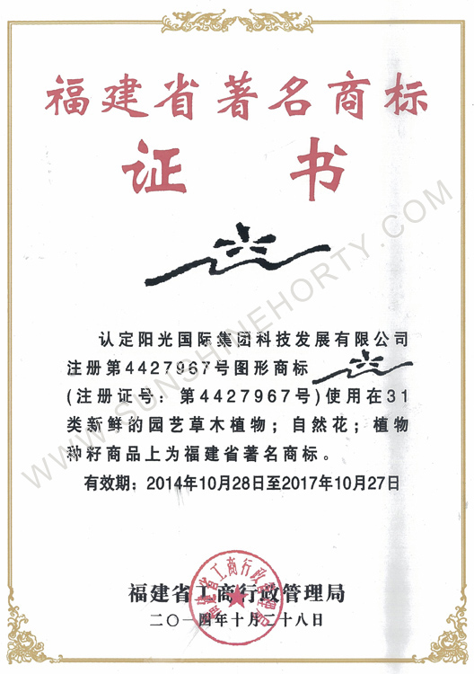 福建省著名商標(biāo)證書